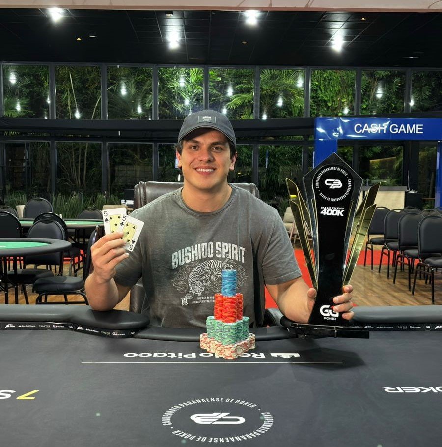 Ele revela que resolveu escolher uma estratégia um pouco mais conservadora no heads up: “No HU foi até um pouco demorado, mas usei a estratégia de jogar mais pós flop e na paciência, optei por não levar para a variância”, conclui o grande campeão dessa 4ª etapa do Campeonato Paranaense de Poker 2025.
