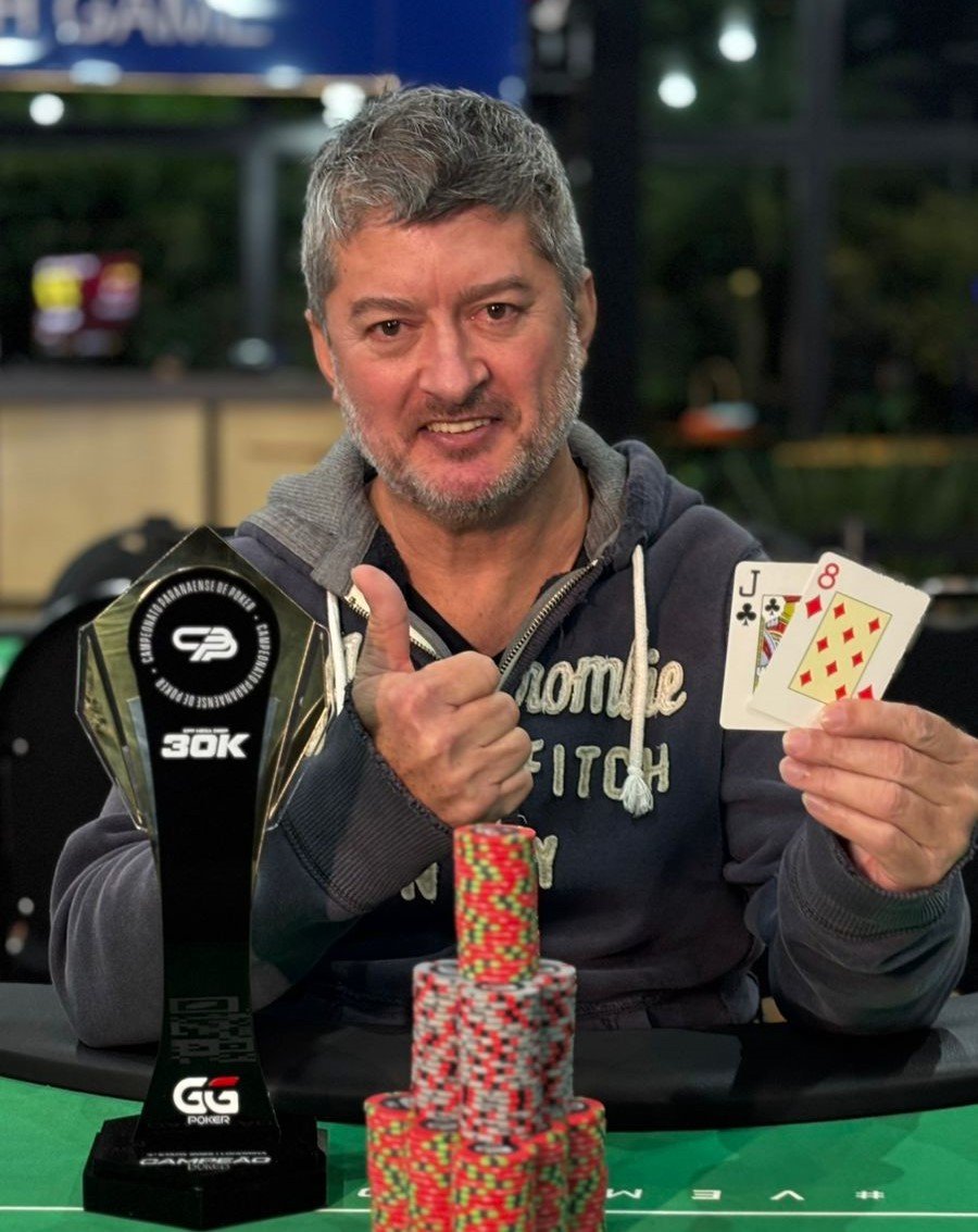 O HU não demorou, ao contrário do restante do torneio: “O heads up foi rápido, acabei acreditando nas cartas e fui com J8, no turn o adversário tinha par e flush draw e acabou não batendo river. Aí no river foi só botar o restante e ele acabou pagando”.