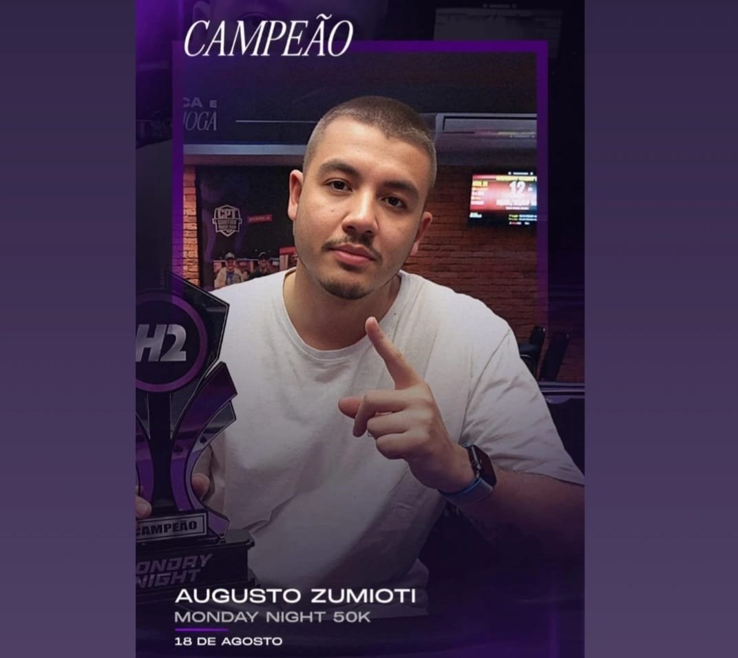 O jogo não teve grandes ações para o campeão Augusto Zumioti até chegar na FT: “Acredito que foi só quando chegamos em 6 na FT, pois até lá eu fui chegando short. Em 6 jogadores eu ganho um flip de 33 x AJ e volto para a média do torneio, então começo a acreditar que dá para cravar. Antes disso foi um jogo jogado, mas esse flip foi decisivo, pois se eu perdesse, cairia do torneio”.