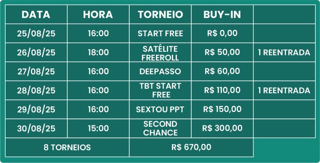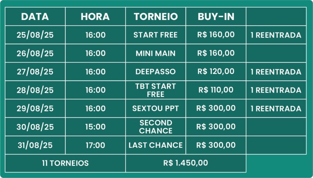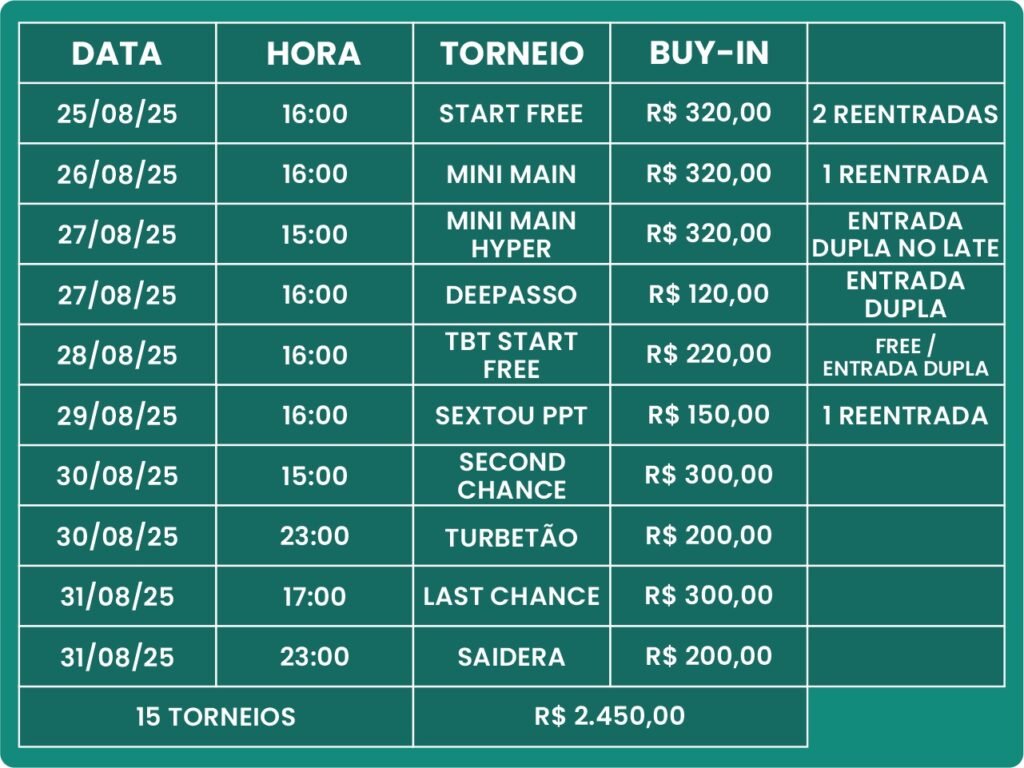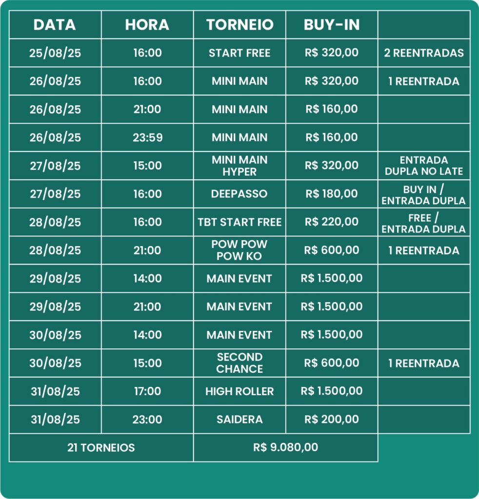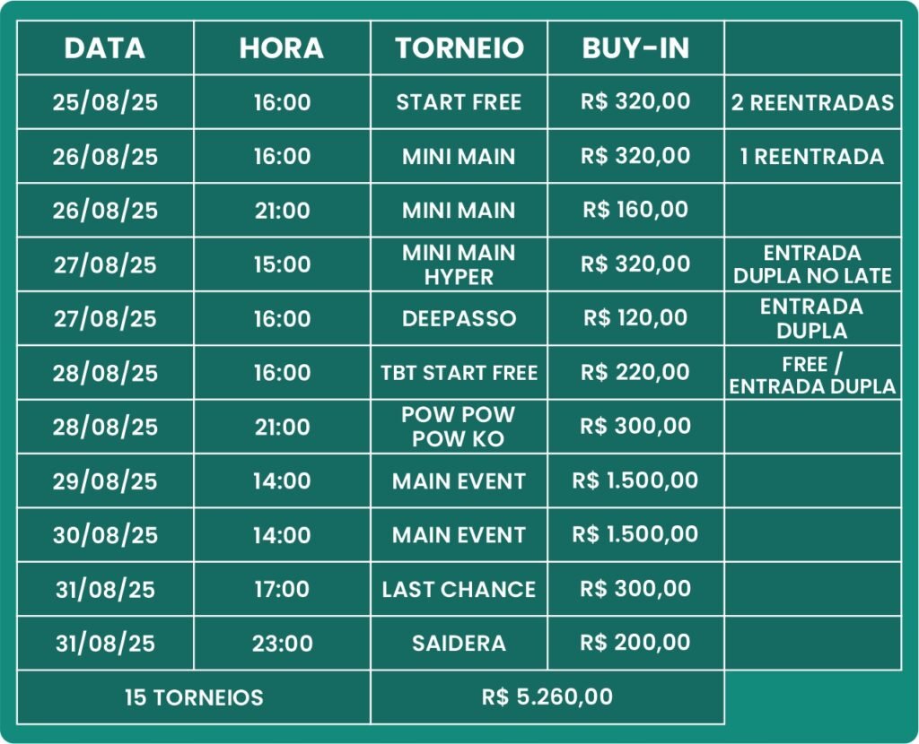 Com uma premiação garantida na etapa de R$ 2.000.000, o evento conta com buy-ins para todos os bolsos. De entradas grátis (sim, 0800!) com premiação de R$ 100.000 no torneio inicial, a um torneio PKO de R$ 3.000 de buy-in. O Main Event garante R$ 1.000.000 de premiação total com buy-in de R$ 1.500, garantindo uma forra colossal para o campeão.